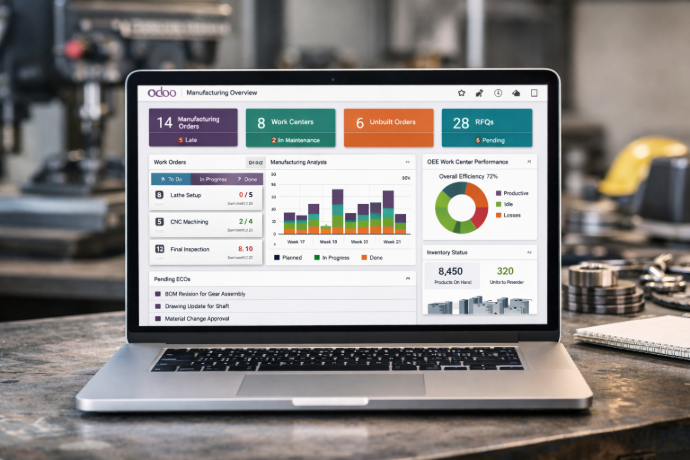 Specialising in engineering and manufacturing, we help industrial businesses streamline operations and gain real-time visibility across their entire value chain. We implement and customize Odoo to support complex Sales, BoMs, quality control, maintenance, and engineer-to-order or make-to-order workflows—delivering scalable solutions that improve efficiency, reduce costs, and drive growth.
